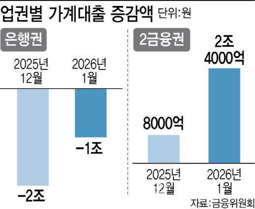 11일 금융위원회에 따르면, 지난달 모든 금융권의 가계대출은 1조4000억원 늘어 한 달 만에 증가세로 전환했다. 이는 작년 1월(9000억원 감소), 재작년 1월(9000억원 증가)과 비교해 높은 수준이다. 주택담보대출(주담대)만 놓고 보면 한 달 새 3조원 늘었다. 은행권 주담대는 6000억원 줄어 작년 12월(5000억원 감소)에 이어 두 달째 감소했지만, 2금융권은 농협·새마을금고 등 상호금융권을 중심으로 3조6000억원 늘어 12월(2조8000억원)보다 증가 폭이 확대됐다. 저축은행 가계대출도 3000억원 늘며 증가세로 돌아섰다.