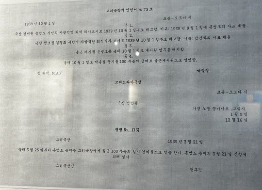 고려극장을 찾았을 때 오래 발걸음을 멈추게 한 전시물이 있었다. 1939년 3월 25일자 근무 명령서였다. ‘홍범도 동지를 고려극장 월급 100루블의 임시 경비원으로 임명한다’는 내용이었다. 독립운동가 홍범도 장군의 생애 마지막 직업은 크즐오르다 고려극장의 경비원이었다.