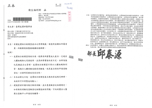 지난해 5월 대만 위생복지부(MOHW)는 대만피부과의학회를 비롯한 18개 주요 의학회와 대학병원에 ‘피부분말주사제형 제품관리규정’에 관한 공문을 전달했다. 대만 위생복지부는 인체 조직물이라는 명목으로 관리사각지대에 있었던 제품인 ‘피부분말주사제형(Dermal Powder Injectable)’은 과학적 증거가 부족하다고 지적했다.