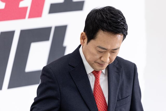 장동혁 국민의힘 대표가 12일 서울 여의도 국회에서 이재명 대통령과 청와대 오찬에 불참하기로 결정한 뒤 입장을 밝히기 위해 착석하고 있다. / 뉴스1