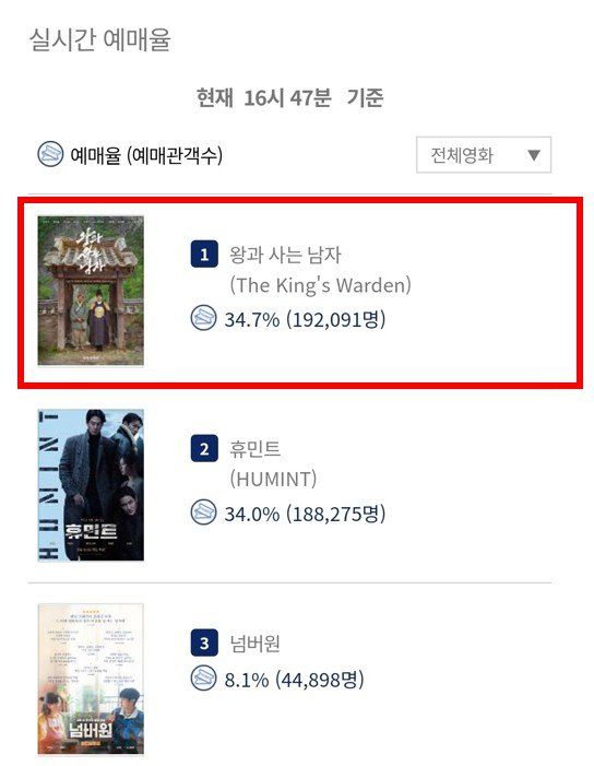 [스포츠동아 이정연 기자] 영화 ‘왕과 사는 남자’가 설 연휴를 앞두고 전체 예매율 1위를 기록하며 흥행 기세를 끌어올렸다.