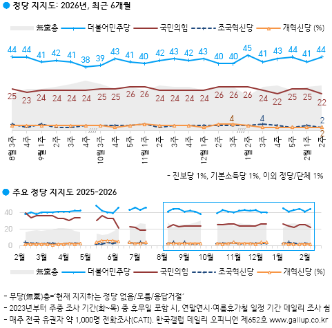 한국갤럽이 지난 10~12일 전국 만 18세 이상 남녀 1003명을 대상으로 정당 지지율 조사를 실시한 결과(95% 신뢰수준에 ±3.1% 포인트) 민주당 44%, 국민의힘 22%, 조국혁신당 2%, 개혁신당 2%, 진보당 1% 등으로 나타났다.