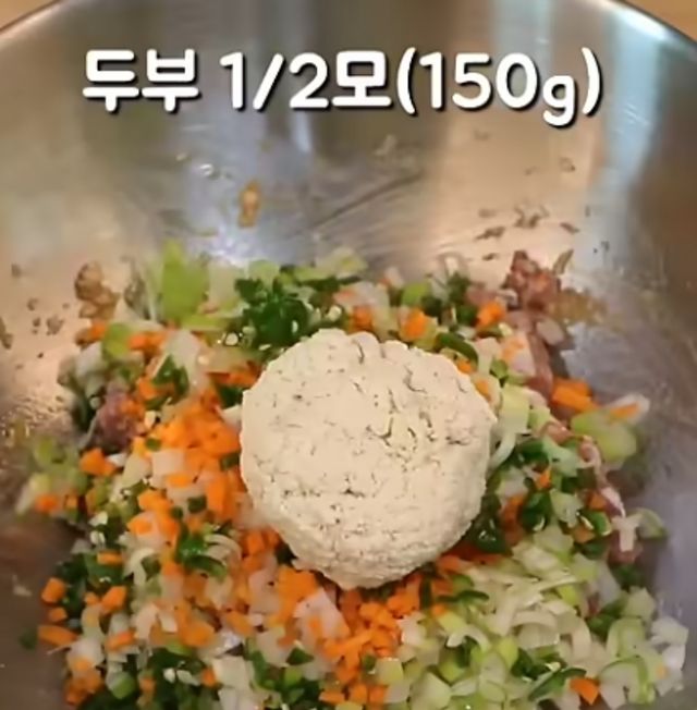다음으로 두부 1/2모를 으깨준 후 물기를 쫙 빼준다. 다음으로 다진 양파 1/4개, 다진 당근 1/4개, 다진 대파 1/2대, 다진 청양고추 3개를 차례로 그릇에 붓는다. 앞서 으깼던 두부 또한 섞어준다. 기호에 맞게 소금으로 간을 맞춰준다. 이후 계란 3개를 깨뜨려 넣은 뒤 소금 2꼬집을 뿌려 계란물을 만든다.