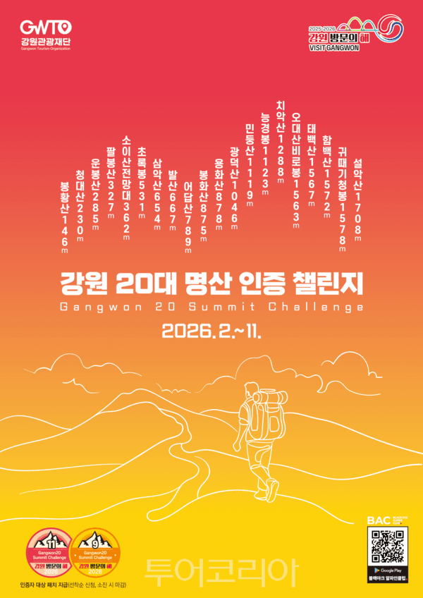 [투어코리아=이철진 기자] 지난해 9만여 명이 참여해 약 56억 원의 지역경제 파급 효과를 거둔 ‘강원 20대 명산 인증챌린지’가 올해 다시 재개된다.