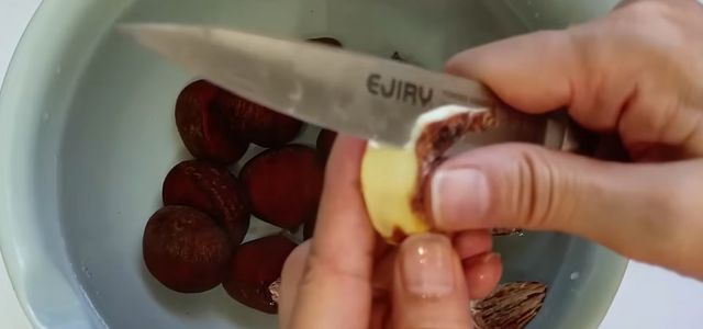윤기가 도는 갈색 껍질을 벗겨내는 일은 생각보다 만만치 않다. 단단한 겉껍질에 칼이 미끄러지기 쉽고, 조금만 방심하면 손을 다치기 십상이다.