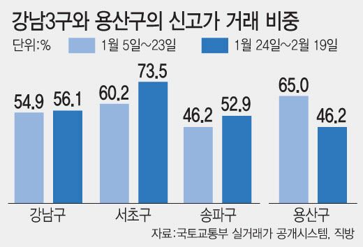 19일 국토교통부 실거래가 공개시스템과 직방에 따르면 강남3구와 용산구의 전체거래에서 신고가 거래비중은 이 대통령 발언 직전 3주(1월 5일~23일)와 직후 3주(1월 24일~2월 19일)에서 각각 53.0%와 56.2%로 큰 차이를 보이지 않았다.