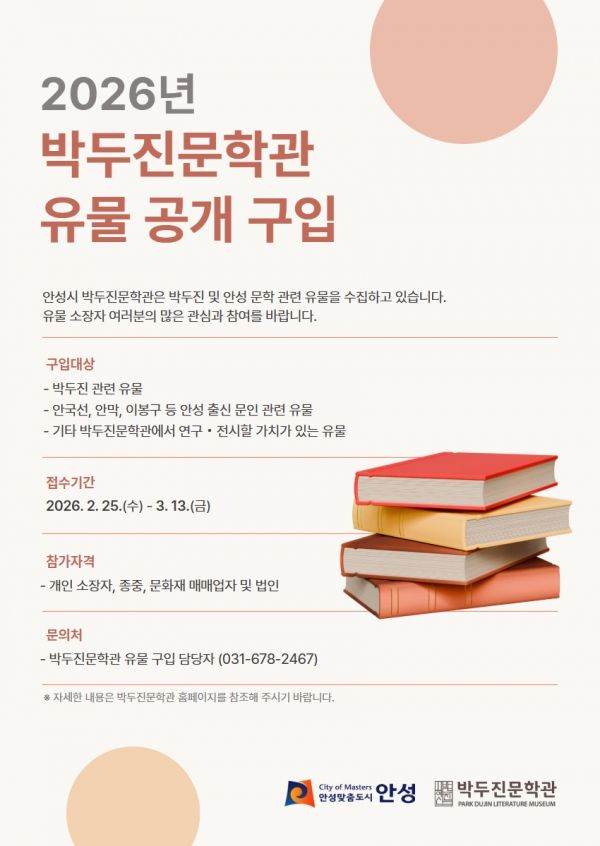 유물 구입 서류 접수 기간은 2월 25일(수)부터 3월 13일(금)까지다. 매도를 희망하는 개인이나 법인은 안성시청 홈페이지에서 서식을 내려받아 작성한 뒤, 등기우편 또는 전자우편으로 제출하면 된다.
