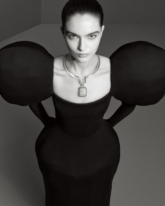 클레어 슈완은 방돔광장의 팔각형 구조에서 영감받은 아카이브 네크리스를 화이트골드와 다이아몬드에 블랙 래커를 더해 재구성했다. 에메랄드 컷의 모티프가 반복되는 미장 아빔 구조를 중심으로 10.01캐럿 다이아몬드를 가운데에 세팅했다. 바게트 컷 · 라운드 컷 · 에메랄드 컷 다이아몬드는 건축적인 레이어드를 통해 각기 최적의 빛을 포착하도록 배치됐다. 블랙 래커로 둘러싸인 관절 구조는 하나의 조각처럼 목선을 따라 유연하게 흐른다. 중앙 모티프를 분리하면 링으로도 연출할 수 있게 설계됐다.