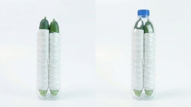 감싼 오이는 꼭지 부분이 위로 향하도록 세워서 페트병 안에 넣는다. 오이가 자연 상태에서 자라던 환경을 유지해 신선함을 높이는 것이다. 또한 오이를 눕혀 두면 바닥에 닿은 부분이 쉽게 물러질 수 있는데, 세워 두면 이런 접촉면이 줄어드는 효과가 있다.