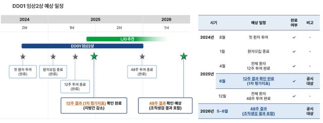 결국 투자자들의 시선은 DD01의 48주 조직생검 결과로 쏠린다. 해당 데이터가 드러나기 전 딜이 성사될 경우 계약 규모는 보수적으로 책정될 것으로 예상된다. 반대로 해당 데이터 공개 이후 딜이 체결될 경우 결과에 따라 ‘조 단위’로 점프할 가능성도 열려 있다.