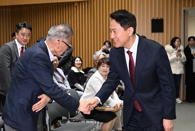 오세훈 서울시장이 26일 서울시청에서 열린 '8만5000호 신속착공 발표회'에서 조합장과 악수하고 있다. Ⓒ 서울시