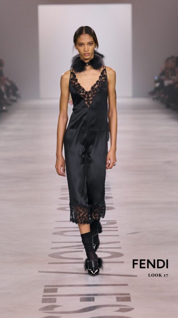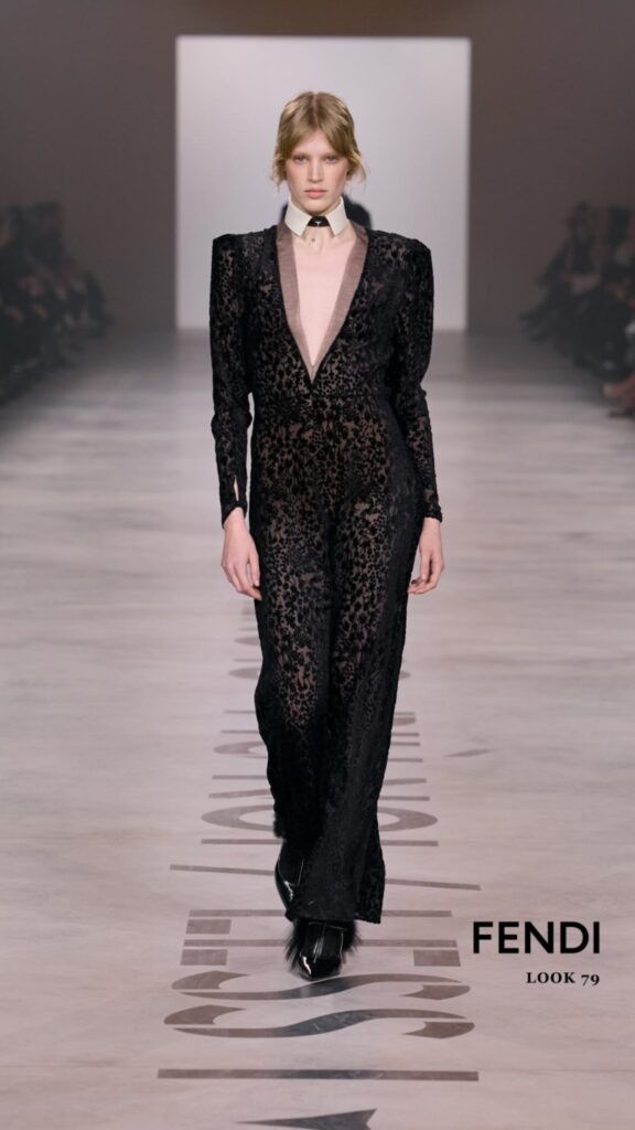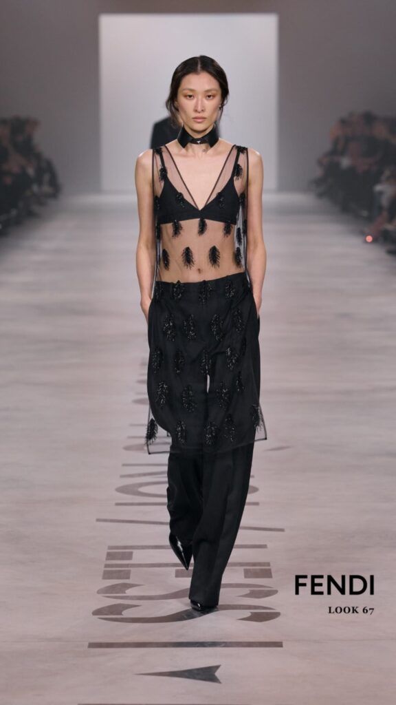레이스와 튤 소재를 활용한 드레스는 부드러운 관능미를 더했고, 시스루 레이어링은 움직임에 따라 섬세하게 빛을 머금었습니다. 기하학적인 커팅과 20세기 초 이브닝웨어에서 가져온 디테일은 펜디의 미학을 다시 한번 환기하죠. 하우스의 헤리티지인 모더니즘에서 출발해 칼 라거펠트를 거치며 정교하게 다듬어진 빈 분리파(Vienna Secession)의 레퍼런스를 현대적인 언어로 풀어낸 것입니다.
