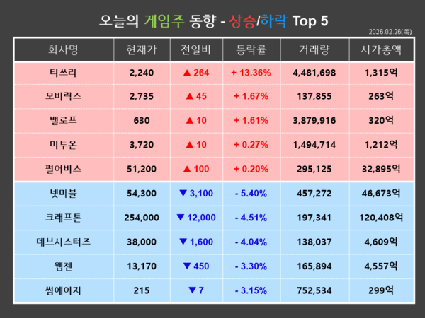 반면, 넷마블은 금일(26일) 전거래일 대비 5.40%(3,100원) 하락한 54,300원에 장을 마감했다. 개인이 156,046주를 순매수한 반면, 기관과 외국인이 각각 90,715주, 57,834주를 순매도하며 종일 약세를 면치 못했다.