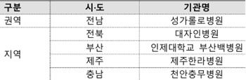 권역센터로는 전남 성가롤로병원, 지역센터로는 전북 대자인병원, 인제대학교 부산백병원, 제주 제주한라병원, 충남 천안충무병원이 각각 이름을 올렸다.