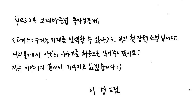저에게 『타이드』는 아인의 변신에 관한 소설입니다. 이 이야기가 독자 여러분께 어떻게 받아들여질지는 모르겠어요. 읽는 분들이 어떤 식으로든 이 이야기와 내 세상이, 이 인물들과 내가 연결되었다고 느껴주신다면 가장 좋을 것 같습니다.