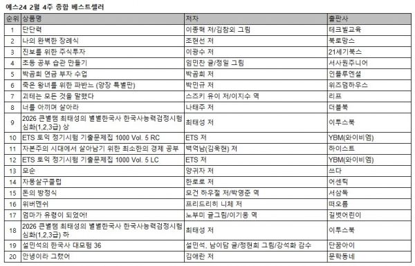 예스24 2월 4주 종합 베스트셀러 순위에서 교사 업무일수에 최적화된 실전 일력북 『단단력』이 종합 1위를 차지했다. 이어 조현선 작가의 신작 『나의 완벽한 장례식』이 2위, 이광수 교수의 『진보를 위한 주식투자』가 3위에 올랐다. 임민찬 작가의 『초등 공부 습관 만들기』는 4위, 박곰희 작가의 『박곰희 연금 부자 수업』은 5위를 기록했다.
