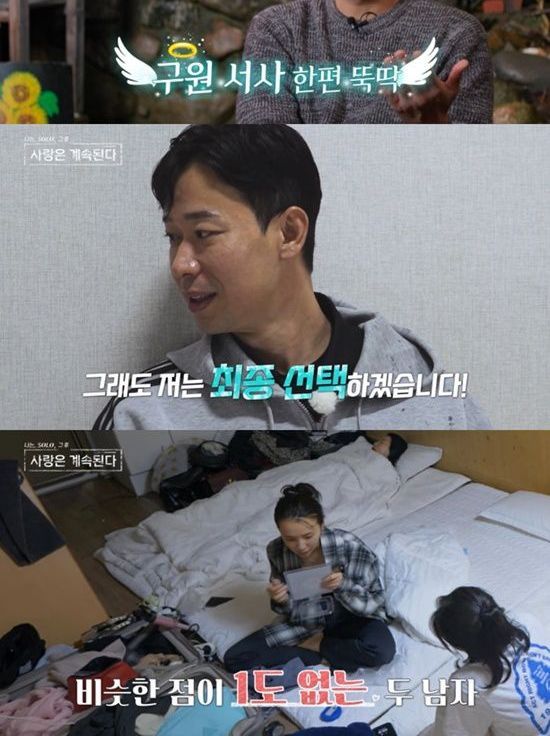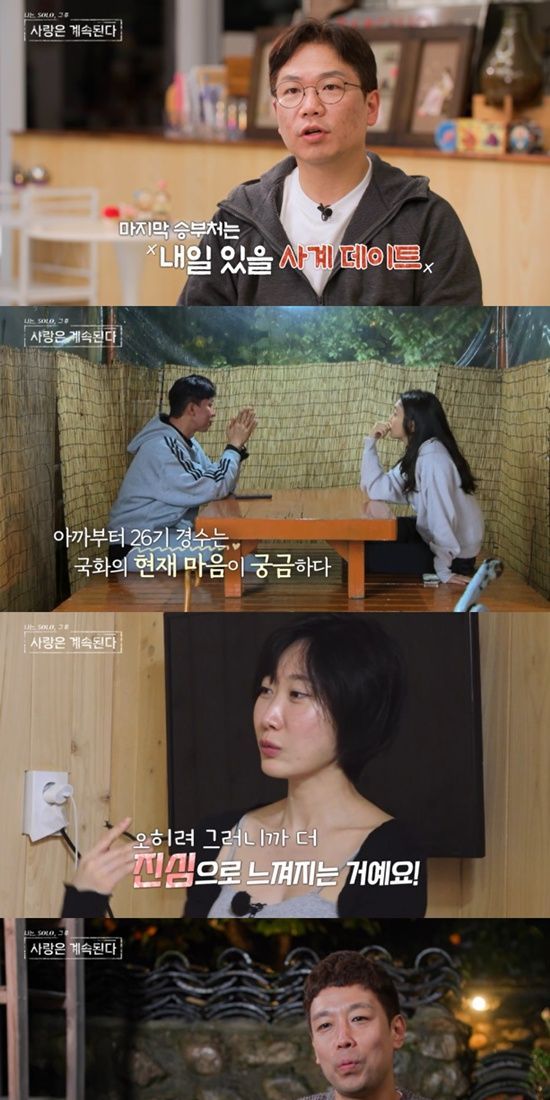 지난 26일 방송된 SBS Plus·ENA '나는 SOLO, 그 후 사랑은 계속된다'(이하 '나솔사계')에서는 최종 선택 전날까지도 '반반 마음'으로 22기 영수와 26기 경수를 두고 방황하는 국화의 모습이 공개됐다.