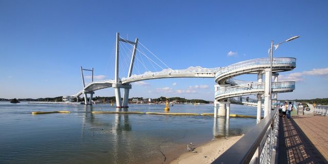 다리의 구조 또한 눈길을 끈다. 입구부터 나선형 오르막길 형태로 설계돼 동선이 부드럽고, 계단 없이 이동할 수 있는 무장애 구간으로 조성되어 휠체어나 유모차를 동반한 방문객도 비교적 편하게 오를 수 있다. 천천히 걸음을 옮기다 보면 발 아래로 바닷물이 출렁이고, 다리 중간 지점에는 조타 핸들 모양의 조형물이 설치돼 잠시 걸음을 멈추고 주변 풍경을 둘러보게 한다. 물때에 따라 풍경은 확연히 달라진다. 갯벌이 넓게 드러나는 날에는 서해 특유의 지형이 시원하게 펼쳐지고, 수위가 차오르면 푸른 바다가 시야를 채우며 또 다른 인상을 남긴다.