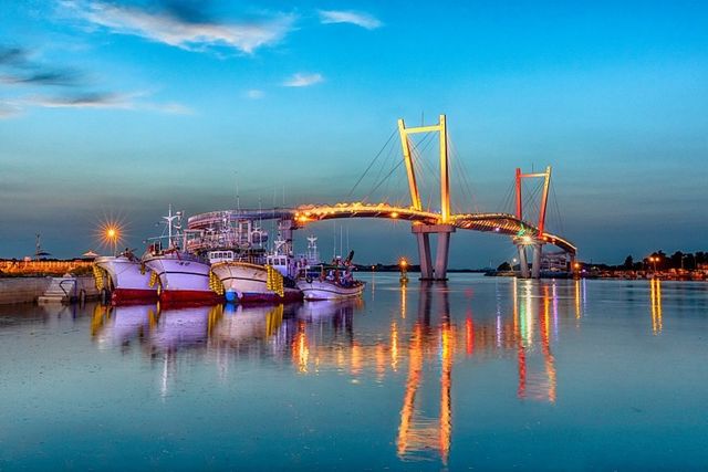 해 질 무렵에는 꽃게다리의 매력이 더욱 또렷해진다. 서쪽 하늘로 기울어가는 빛이 교량의 구조물 사이로 스며들며 바다 위에 길게 번지면, 걷는 내내 시선이 자연스레 노을을 향한다. 해가 완전히 저문 뒤에는 야간 조명이 켜져 낮과는 다른 분위기가 만들어진다. 조명은 시간에 따라 색이 바뀌어 바다 위로 은은한 반영을 남기고, 늦은 시간까지 산책을 즐기는 이들의 발길을 붙잡는다.