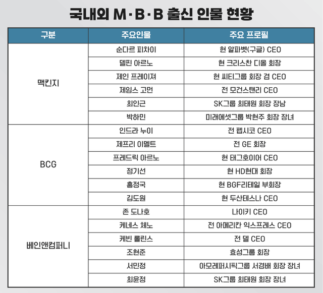 글로벌 경영 현장에서 전략 컨설팅사 출신들의 영향력이 갈수록 커지고 있다. 분야가 전혀 다르더라도 같은 글로벌 기업 규모라면 전략 컨설팅사 CEO 영입을 자연스럽게 여기는 분위기다. 다수의 전략 컨설팅사 중 CEO 배출 측면에서 가장 두각을 나타내는 곳은 맥킨지, BCG, 베인앤컴퍼니 등 이른바 'MBB'가 꼽힌다. 국내 재계에서도 SK그룹와 아모레퍼시픽그룹 등 주요 기업 후계자들이 경영 일선에 나서기 전 MBB를 거치는 것이 이미 '필수 경영 코스'로 자리매김했을 정도다.