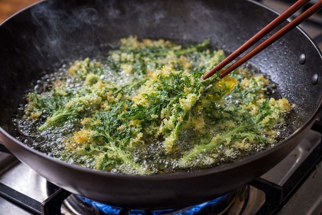 기름 온도는 120도 안팎으로 맞춘다. 쑥갓을 반죽물에 담갔다가 꺼낼 때는 튀김옷이 너무 많이 묻지 않도록 탈탈 털어낸 뒤 기름에 넣어야 한다. 한꺼번에 많은 양을 넣으면 기름 온도가 뚝 떨어지므로 조금씩 나눠 튀기는 것이 좋다. 온도가 너무 낮으면 튀김이 기름을 잔뜩 머금어 눅눅해지고 바삭함이 살지 않는다. 반대로 온도가 지나치게 높으면 겉만 타고 속은 익지 않는다. 노릇노릇하게 색이 올라오면 건져 기름을 빼고, 소금을 살짝 뿌려 먹으면 된다. 튀기기 직전에 반죽물에 담가야 하며, 미리 담가두면 반죽이 흐물흐물해져 좋은 식감을 낼 수 없다.