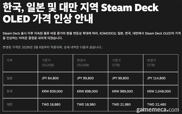 이번 가격 인상에 대해 코모도는 "스팀 덱 출시 후 지속된 물류 비용 증가와 환율 변동성 확대에 따라 일본, 한국, 대만에서 스팀 덱 OLED 가격을 인상하는 어려운 결정을 내렸다. 변동된 가격은 3월 6일부터 적용된다"라며 "홍콩은 해당 요인의 영향이 상대적으로 적어 가격 변동 없이 유지된다"라고 설명했다.