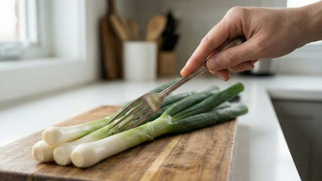 우선 대파를 먹기 좋은 길이로 나눠 썬다. 너무 길면 힘을 주기 어렵기 때문에 손에 쥐기 편한 5~7cm 정도로 자르는 것이 좋다. 그다음 포크를 대파 단면에 깊숙이 찔러 넣는다. 포크 끝이 대파 속을 통과하도록 충분히 눌러 넣은 뒤, 그대로 길이 방향으로 쭉 긁어내리면 된다. 그러면 결을 따라 일정한 굵기의 가느다란 파채가 자연스럽게 만들어진다. 마지막으로 포크가 닿은 부분을 칼로 한 번 잘라주면 채가 분리된다. 칼로 일일이 얇게 썰지 않아도 비교적 균일한 두께의 파채가 완성되는 셈이다.