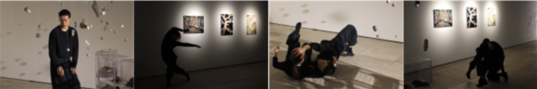 평면 작업 이외에도 설치 및 다양한 여러 분야의 예술가와의 협업을 시도하고 있습니다. 지난해 3월 서리풀청년아트갤러리에서 <넘어지고, 넘어지며, 넘어지는> 전시 기획 총괄을 맡으며, 전시 기조였던 ‘애도와 상실’을 조금 더 시각적인 울림을 더하고자 한국예술종합학교 무용이론과 김다연 퍼포머님과 서울대학교 미술대학 영상매체예술전공 우탁 퍼포머님과의 즉흥 퍼포먼스를 기획했습니다. 전시 중 선보인 <애도 덩어리와 상실 더미> 라는 작품에 내포돼 있는 서정적인 감각을 음악과 퍼포머의 움직임을 통해 애도와 상실이라는 키워드에 맞춰 20분 가량 즉흥 무용을 선보였습니다. 애도> 넘어지고,>