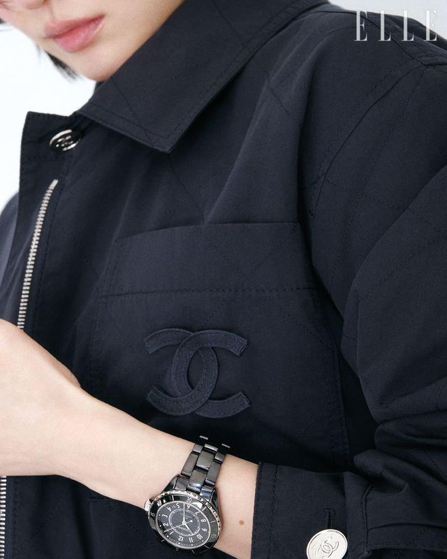 블랙 세라믹과 스틸 케이스가 조화를 이룬 J12 워치 칼리버 12.1 38mm 워치, 퀼팅 모티프를 따라 다이아몬드를 세팅한 옐로골드 코코 크러쉬 이어링은 모두 Chanel Watches & Fine Jewelry.