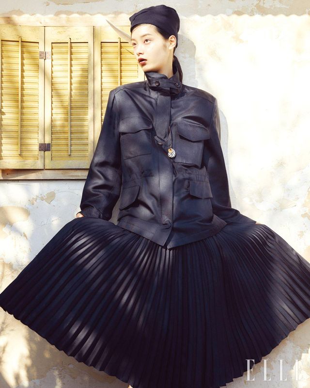 포켓 디테일의 아이콘 트래블러 재킷과 플리츠 스커트, 목에 건 셸 참, 햇은 모두 Loro Piana.