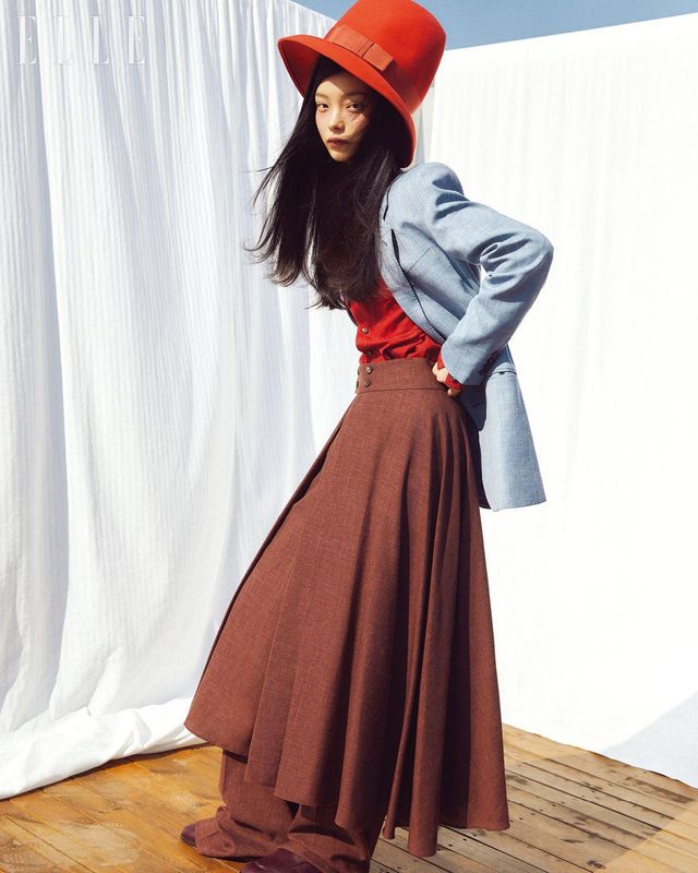 재킷과 셔츠, 팬츠와 함께 레이어드한 스커트, 깊고 둥근 실루엣의 햇, 카프스킨 세르지오 로퍼는 모두 Loro Piana.