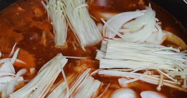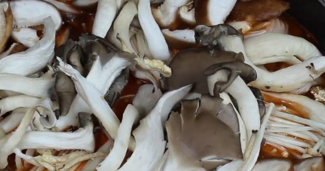 그다음 버섯을 종류별로 넣는다. 두꺼운 표고와 새송이를 먼저 넣고 5분 정도 끓인 뒤, 느타리와 팽이버섯을 넣는다. 버섯은 오래 끓이면 식감이 지나치게 물러지므로 마지막 5분 안에 넣는 것이 좋다. 두부를 넣는다면 이 시점에 함께 넣는다.