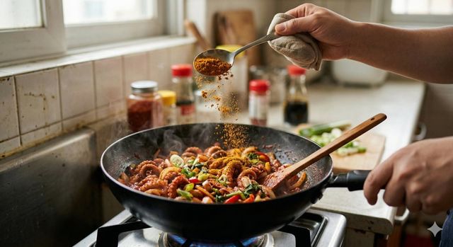 카레 가루는 해산물 특유의 비릿한 향을 완벽하게 잡아준다. 또한 양념의 색을 더 선명하게 만들고 입안에 감기는 맛을 진하게 해준다. 카레 맛이 강하게 날까 봐 걱정할 수도 있지만, 매운 양념과 섞이면 카레 향은 거의 사라지고 고소하고 깊은 맛만 남는다. 카레 가루가 없다면 고운 고춧가루 비중을 높여서 텁텁한 맛을 줄이는 것도 방법이다. 양념장은 미리 섞어서 30분 정도 두었다가 쓰면 재료들이 잘 어우러져 더 맛있는 색이 나온다.