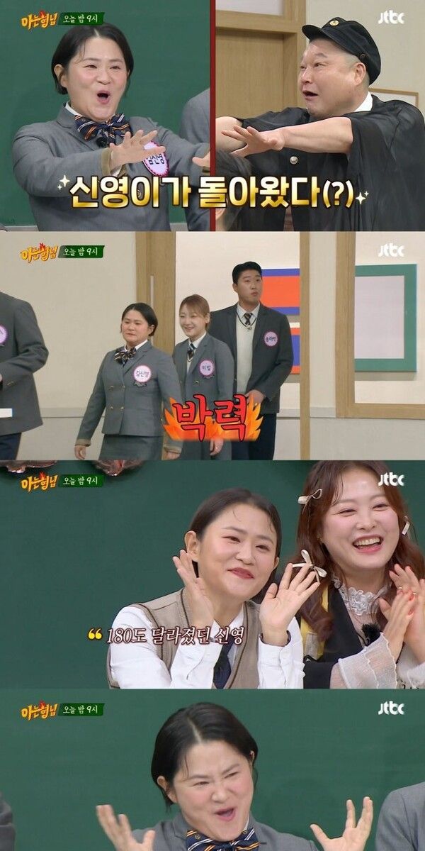 요요마저 예능 소재로 승화시킨 김신영의 거침없는 입담과 변함없는 활약상은 28일 밤 9시 아는 형님 본 방송을 통해 자세히 확인할 수 있다.