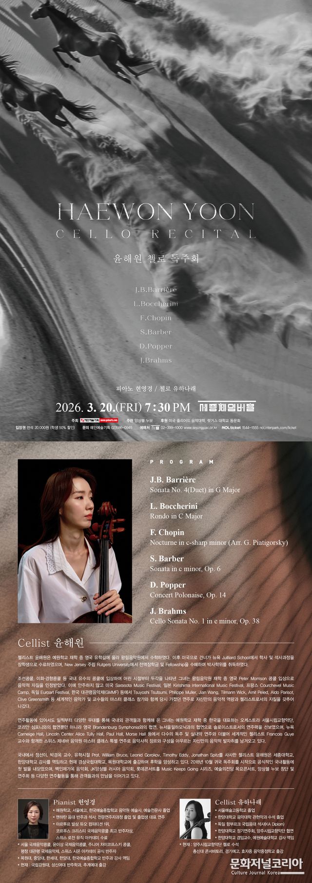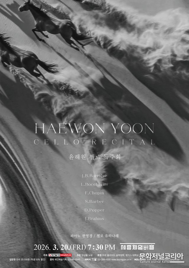 시대를 관통하는 레퍼토리 속에서 첼로라는 악기의 본질을 탐색하는 이번 독주회는, 연주자 윤해원의 음악적 궤적을 확인하는 동시에 관객에게 깊은 울림을 전하는 시간이 될 것으로 기대를 모은다.