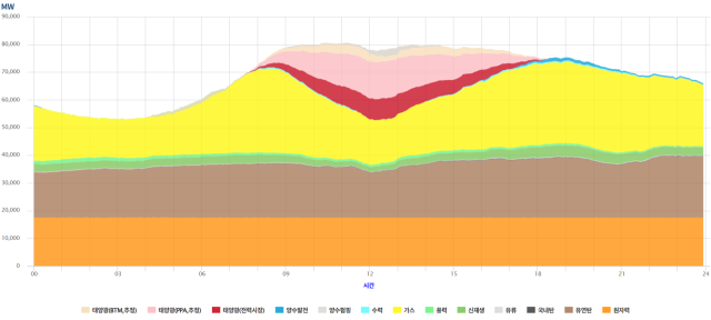 지난달 23일 실시간 전력수급현황인 위 그림을 보면, 핵발전(주황색)의 특징이 뚜렷하다. 전체 전력의 기저처럼, 출력 변동 없이 일정하게 유지된다. 출력 조정은 대부분 가스나 석탄 등의 발전소에서 이뤄진다. 핵발전은 한 번 가동하면 출력을 큰 폭으로 조정하기 어렵고, 연료비가 가장 싸다. 전기 공급의 효율성과 안정성을 위해 기저 부하를 맡기기에 적절했다.