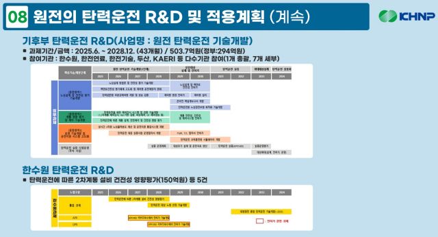 기후에너지환경부는 지난해 6월부터 2028년 12월까지 총 43개월 동안 '원전 탄력운전 기술개발' 사업을 진행한다. 총 503억 7000만 원가량의 연구사업으로, 정부 예산은 294억 원이 투입된다. 한수원, 한전원자력연료, 한전기술, 두산에너빌리티, 한국원자력연구원 등 8개 기업·기관이 참여한다.