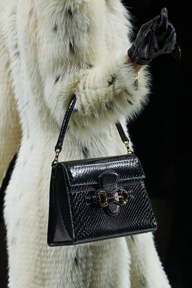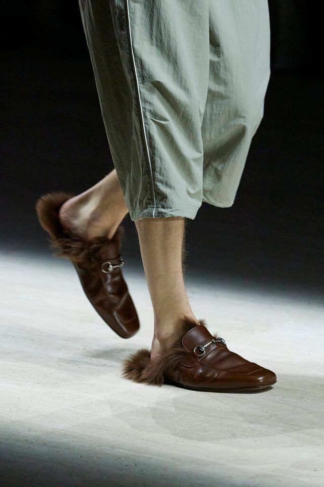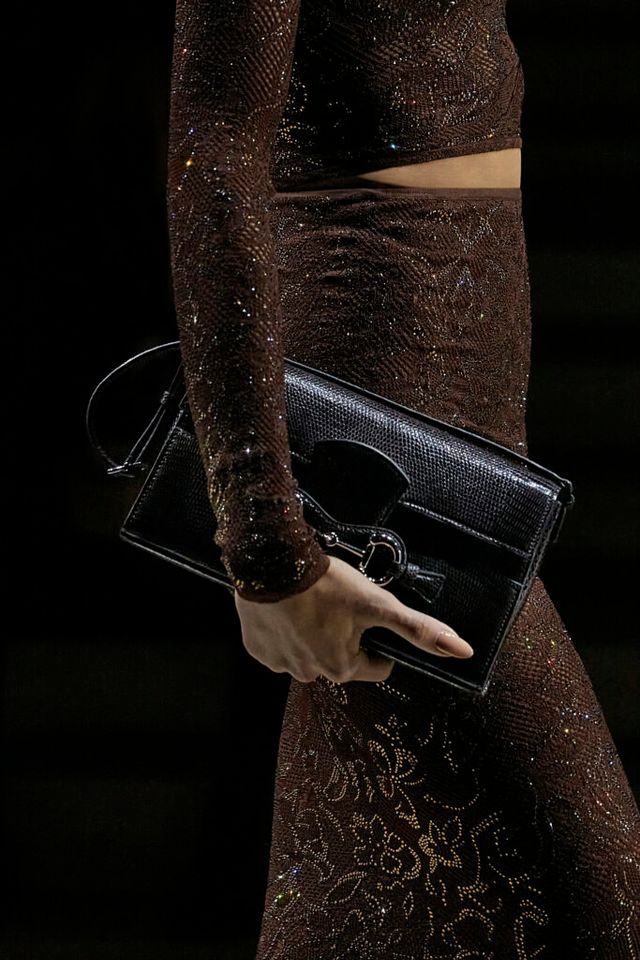 한편 액세서리에도 큰 변화가 돋보입니다. 구찌 뱀부 1947(Gucci Bamboo 1947)은 한층 날렵해진 실루엣으로 다듬어졌고, 상징처럼 여겨지던 대나무 핸들 대신 레더로 완성한 핸들을 적용해 절제된 인상을 남겼죠. 아카이브에서 출발한 미노디에르(minaudières) 클러치는 실용적인 구조로 정제되었고, 지오바니(Giovanni), 쿠페르티노(Cupertino)와 함께 알레산드로 미켈레(Alessandro Michele) 시절 처음 등장했던 홀스빗 퍼 뮬 역시 새로운 균형감을 이루며 슈즈 라인업에 힘을 보탰습니다.