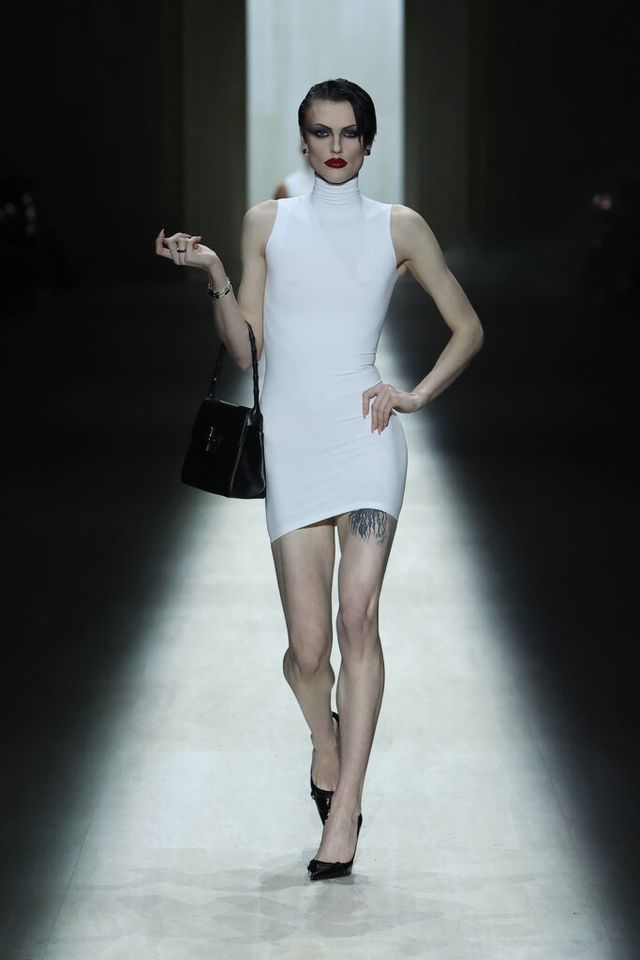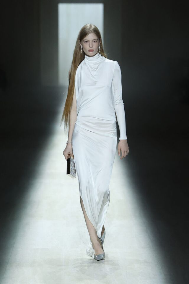 밀라노의 한낮, 팔라초 델레 친틸레. 고대 조각상이 둘러싸인 장엄한 공간에서 적막을 깨고 쇼의 포문을 연 것은 화이트 컬러의 얇고 유연한 심리스 미니 드레스. 장식 대신 몸에 밀착되는 실루엣만으로 완성된 이 드레스는 이번 시즌의 방향을 함축적으로 보여주며 이어질 룩을 예고합니다. 뎀나가 오랜 시간 탐구해온 디자인 언어도 자연스럽게 모습을 드러냅니다. 트랙슈트와 드레스를 결합한 트랙 드레스, 트라우저로 활용한 레깅스, ‘울트라-핏 가먼츠’ 실루엣의 재킷까지. 서로 다른 카테고리의 경계를 흐리고 기능과 형태를 교차하는 시도가 이번 시즌에도 유효하게 이어지며, 구찌의 새로운 문법을 차분하게 확장해 나갑니다.