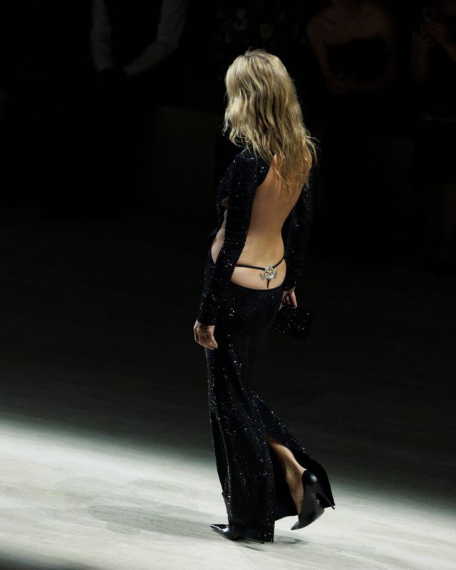 쇼의 마지막 순간, 피날레를 장식한 인물은 케이트 모스(Kate Moss). 다이아몬드를 세팅한 GG 모티브 이너웨어가 은은히 드러나는 백리스 가운을 입고 등장한 그는, 특유의 여유로운 보폭으로 무대를 가로지르며 공기를 단번에 바꾸어 놓았습니다. 과거 톰 포드 시절, 구찌의 이미지를 상징했던 케이트 모스의 존재를 떠올리면, 이번 피날레는 한 시대를 정의했던 ‘구찌적 관능’의 귀환을 암시하는 순간처럼 보입니다.