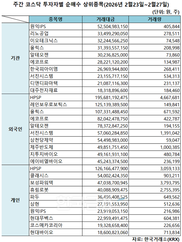 기관 '원익IPS'·외인 'HPSP'·개인 'HPSP' 1위 [주간 코스닥 순매수- 2026년 2월23일~2월27일]
