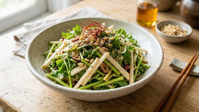 완성된 미나리 배채 샐러드는 첫인상부터 정갈하다. 초록색 미나리와 하얀 배, 노란 밤, 붉은 대추와 실고추가 어우러져 마치 잔칫상에 올라오는 고급 요리 같다. 한 젓가락 크게 집어 먹어보면 가장 먼저 잣 드레싱의 고소함이 입안을 감싼다. 뒤이어 미나리의 상큼한 향이 터져 나오고, 배의 달콤한 즙이 맛을 깔끔하게 마무리한다.