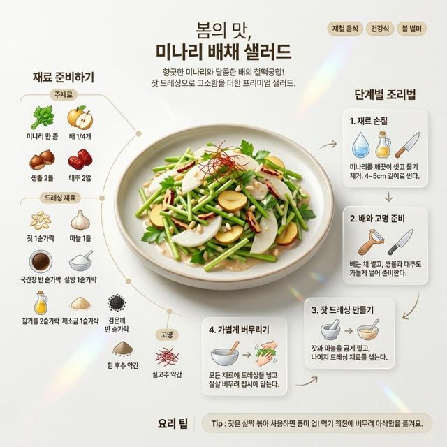 겨울 내내 묵직한 음식에 길들여진 입맛을 깨울 시간이 왔다. 날이 풀리기 시작하면 우리 몸은 본능적으로 상큼하고 생기 있는 음식을 찾는다. 이때 가장 먼저 떠오르는 식재료가 바로 미나리다. 특유의 향긋함과 아삭한 식감을 가진 미나리는 그냥 무쳐 먹어도 좋지만, 달콤한 배와 고소한 잣을 더하면 고급 한정식 부럽지 않은 샐러드가 된다. 오늘은 제철을 맞은 미나리를 활용해 누구나 쉽게 만들 수 있는 '미나리 배채 샐러드' 만드는 법을 소개한다.