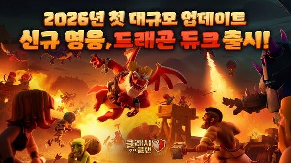 이번 업데이트의 핵심은 신규 영웅 ‘드래곤 듀크’의 등장이다. 드래곤 듀크는 마을회관 15레벨과 영웅회관 9레벨에서 잠금 해제되는 영웅으로, 높은 체력과 분노 능력을 기반으로 한 독특한 전투 스타일이 특징이다. 기본 상태에서는 비교적 낮은 초당 피해량을 보이지만, 분노 발동 시 피해량이 100% 증가하고 공격 속도가 50% 상승하며 함정 피해 감소 효과도 함께 적용된다.
