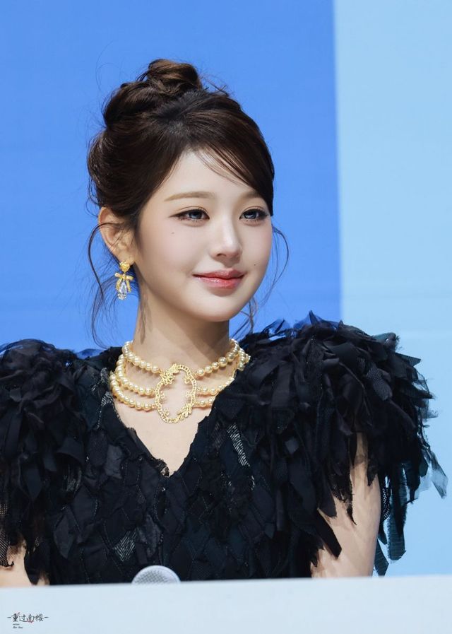 장원영이 선택한 메인 의상은 겹겹이 쌓인 시폰 소재가 돋보이는 블랙 프릴 드레스입니다. 어깨 라인을 화려하게 감싸는 볼륨감 넘치는 프릴 장식은 그녀의 가녀린 목선과 어깨 라인을 더욱 강조하며, 블랙 컬러 특유의 묵직하면서도 고급스러운 분위기를 자아냅니다. 의상의 복잡한 텍스처는 조명 아래에서 섬세한 명암을 만들어내며 룩의 완성도를 높입니다.