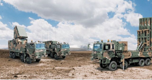 천궁-II 미사일 포대의 모습. 오른쪽부터 이동식 미사일 발사차량, 지휘통제소, 이동식 다기능레이더 차량. ⓒ LIG넥스원