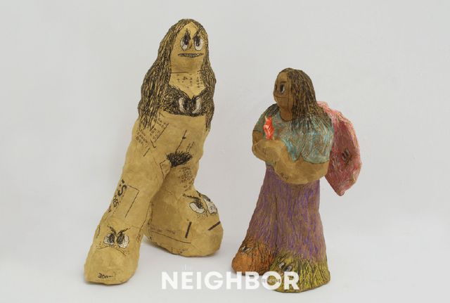 1 신민, ‘Young Joo’, ‘Hee Jung’, 2026, Oil based clay, McDonalds French fries sacks, pencil, 28×20×15cm, 25×14×11cm. P21 제공.