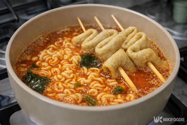 국물이 팔팔 끓기 시작하면 면을 먼저 넣는다. 1분 뒤 준비해 둔 어묵 꼬치를 넣고 총 5분간 더 끓인다. 4분 정도 지났을 때 면을 가볍게 풀어주면 골고루 익는다. 어묵에서 맛있는 성분이 빠져나오며 국물이 한층 묵직해진다.