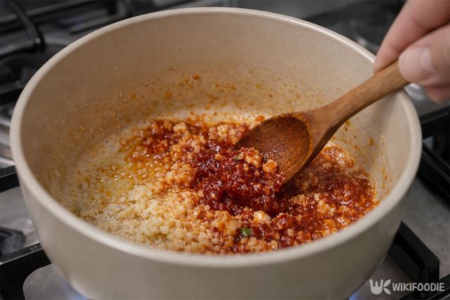 냄비를 충분히 예열한 뒤 식용유를 한 바퀴 두른다. 다진 마늘 0.5큰술을 넣고 볶는데, 마늘은 금방 타서 쓴맛이 날 수 있으므로 반드시 불을 낮춘다. 마늘 향이 올라오면 고추장 0.5큰술을 넣는다. 기름과 고추장이 섞이며 붉은빛이 돌기 시작하면 국물의 기본 바탕이 완성된다.