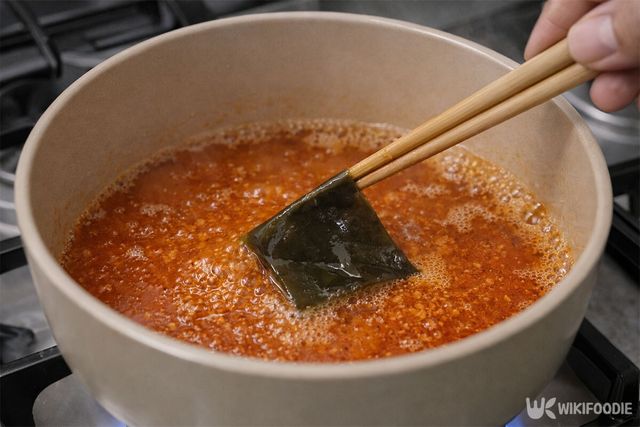 5. 물 700ml를 붓고 다시마, 분말 수프, 건더기 수프, 대파를 넣어 강불에서 끓인다.